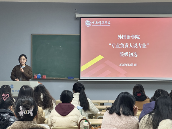 2025年12月4日下午13:00——14:00,外国语学院在许昌校区中兴楼S210教室举办第二届“专业负责人说专业”院级初选活动。本次活动以“深化OBE理念,推进专业内涵建设”为主题,旨在检验专业建设成效、促进跨专业交流,为校级决赛遴选优秀代表。副院长李莉、郭芬出席,各专业负责人及教研室骨干教师参与汇报与评审。